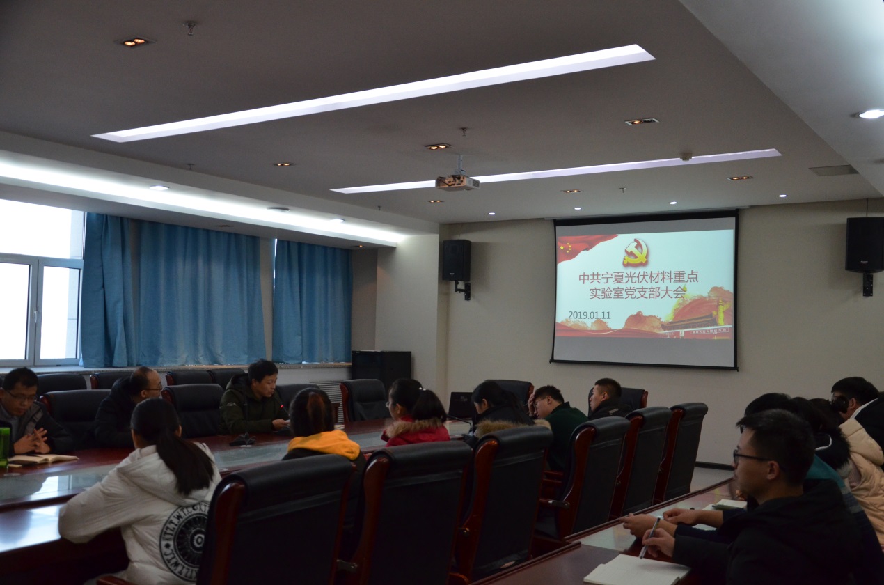 2019年1月11日上午,中共宁夏光伏材料重点实验室党支部召开支部大会,专题学习传达《共产党员不准信仰宗教和参与宗教活动若干规定(试行)》、《自治区党委办公厅关于认真学习宣传和贯彻落实《中国共产党支部工作条例(试行)》的通知》和双色球 《关于召开2018年度基层党组织组织生活会和开展民主评议党员工作的通知》文件内容。全体师生党员和发展对象参加,由党支部书记何力军同志主持学习。