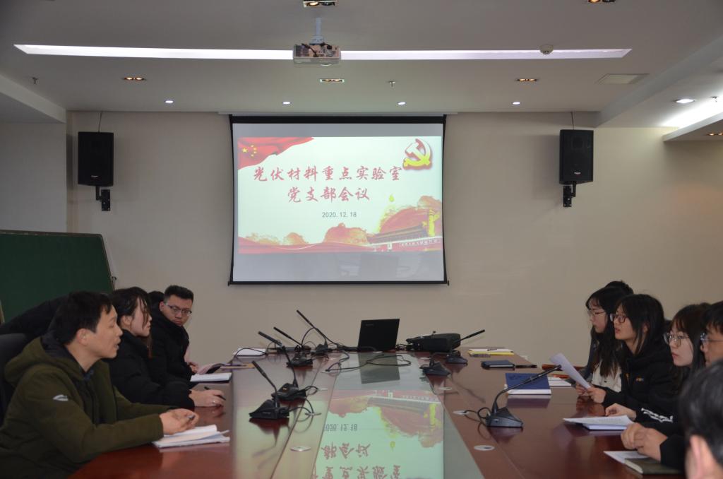 12月18日,中共光伏材料重点实验室党支部在科技楼A601会议室召开支部大会,讨论接收马明远、王宇欢、黄蓉、李瑞、任基宁五位同志为预备党员事宜。会议由支部组织委员马薇同志主持,全体师生党员参会。