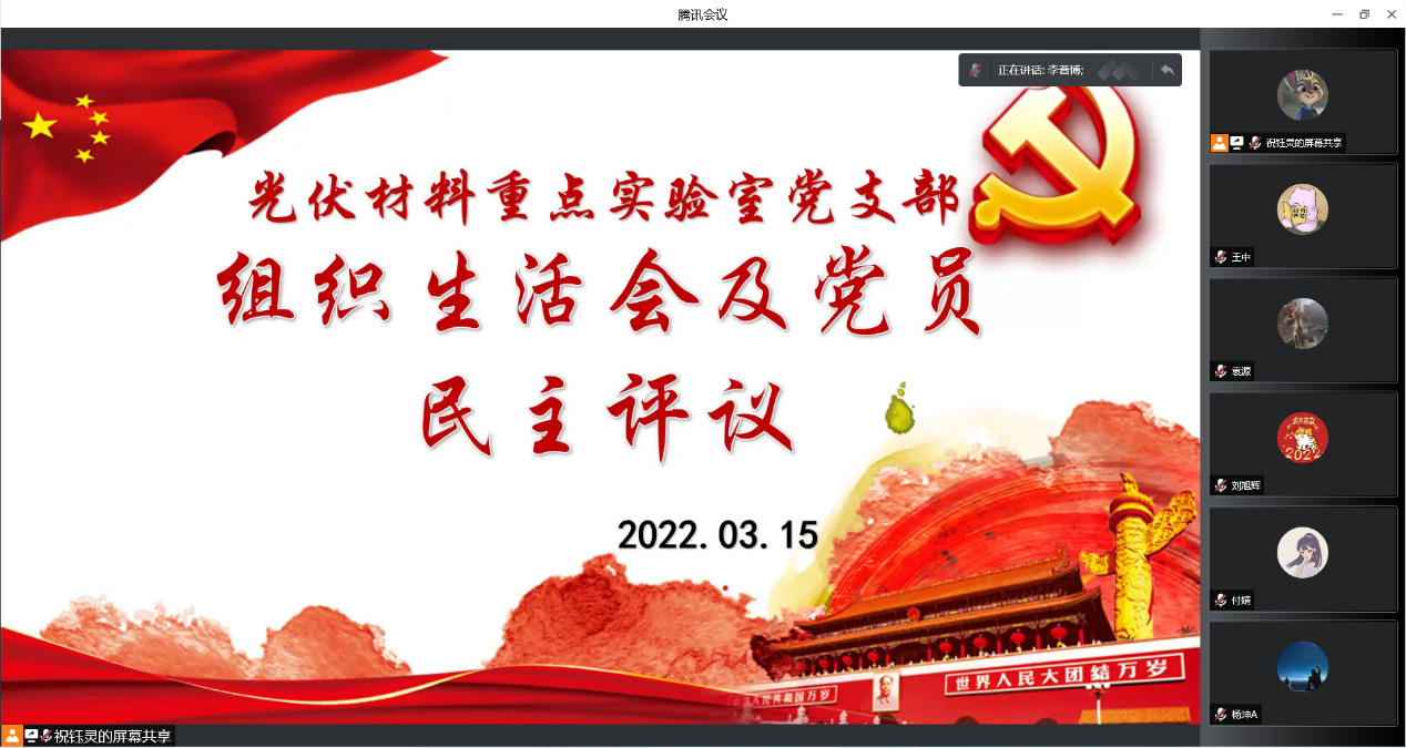 2022315日,宁夏光伏材料重点实验室党支部基于腾讯会议平台在线上召开组织生活会。全体师生党员、积极分子及发展对象共58人参会,会议由党支部组织委员马薇同志主持。