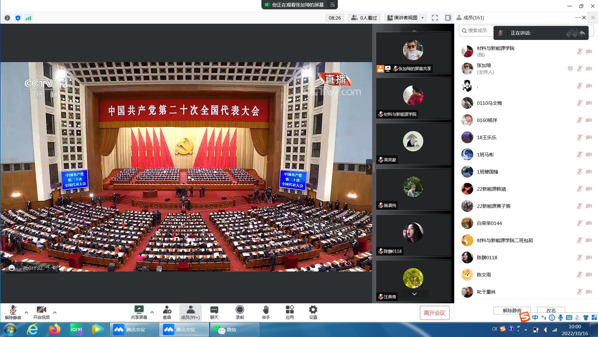 10月16日上午,中国共产党第二十次全国代表大会在北京人民大会堂隆重开幕。中共中央总书记习近平代表第十九届中央委员会向大会作报告。学院全体师生,在抗疫一线、宿舍、家庭等地,通过手机、电脑、电视认真收听收看党的二十大开幕会盛况。
