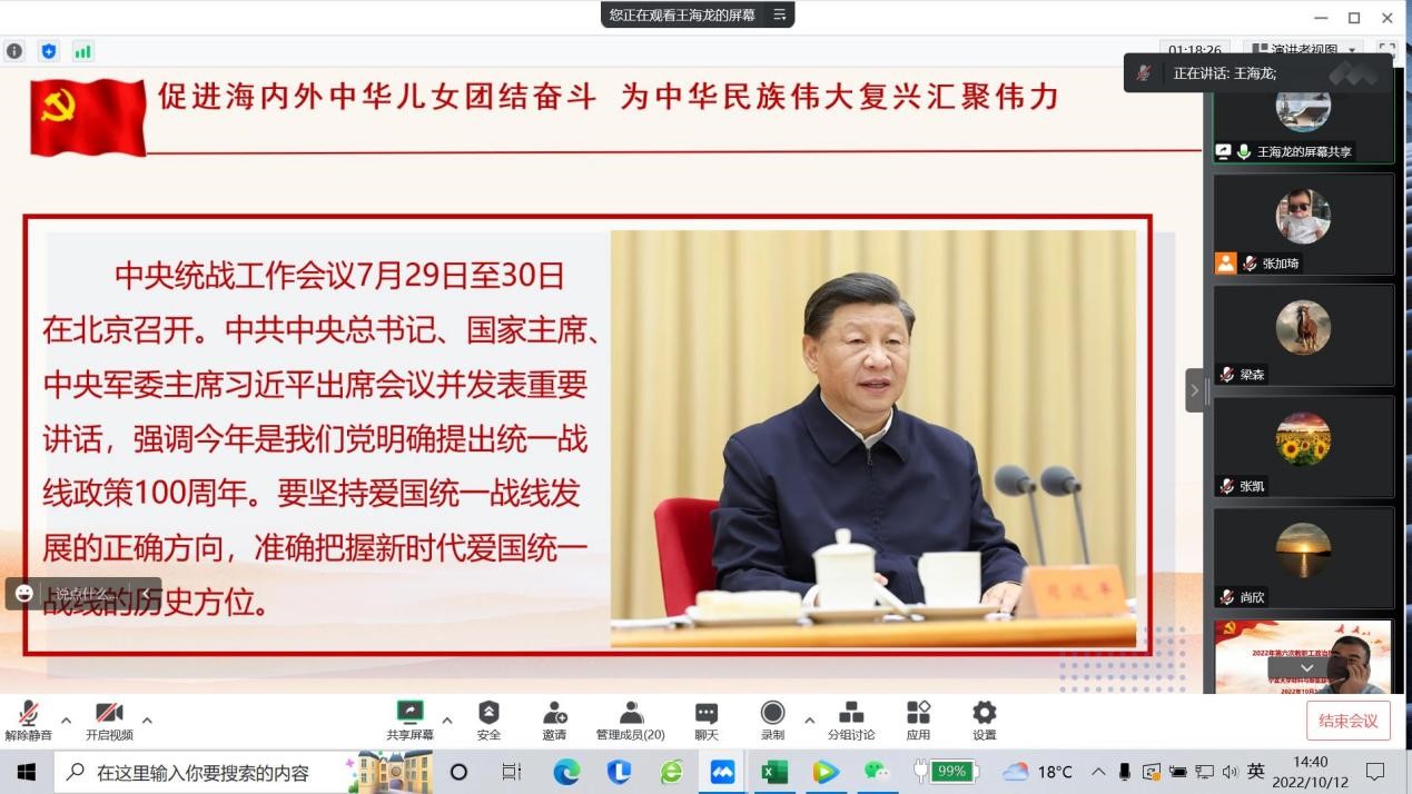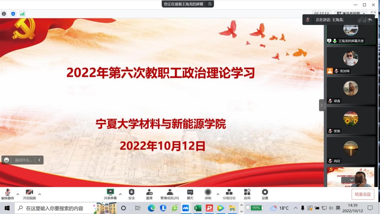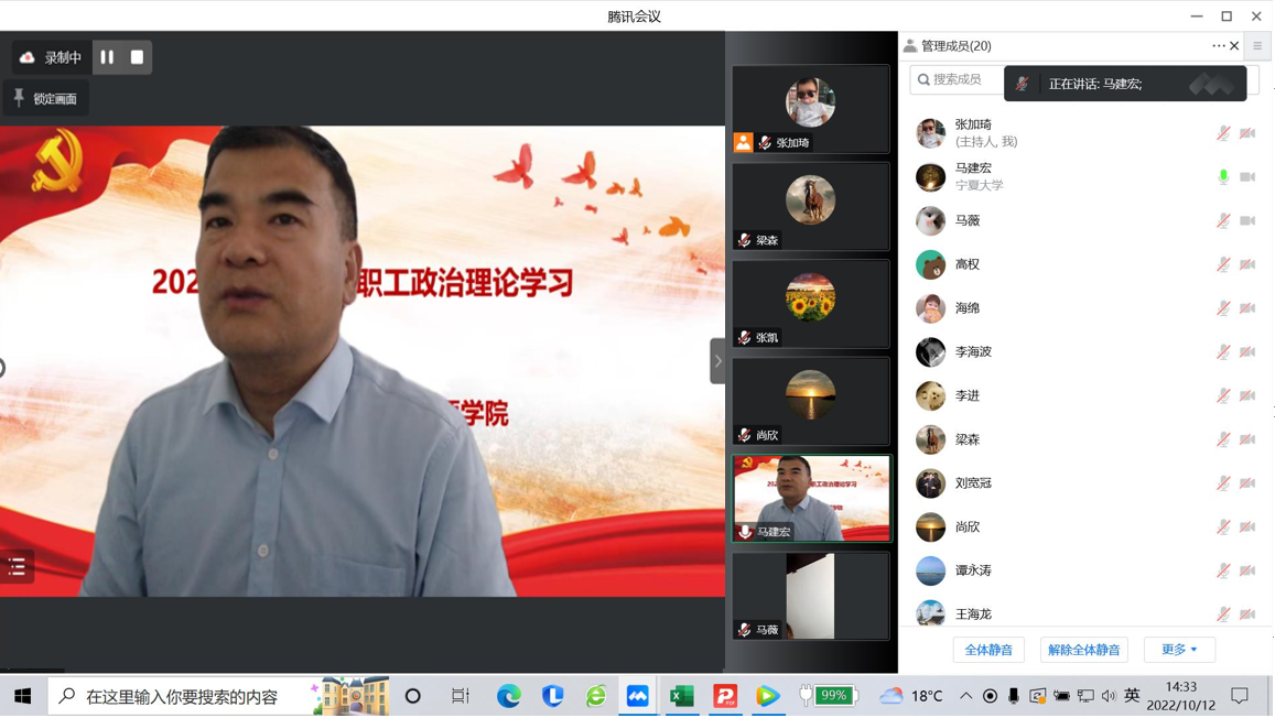 2022年10月12日下午,学院通过线上形式召开教职工政治理论学习会,会议由直属党支部书记马建宏同志主持,全体教职工参加。