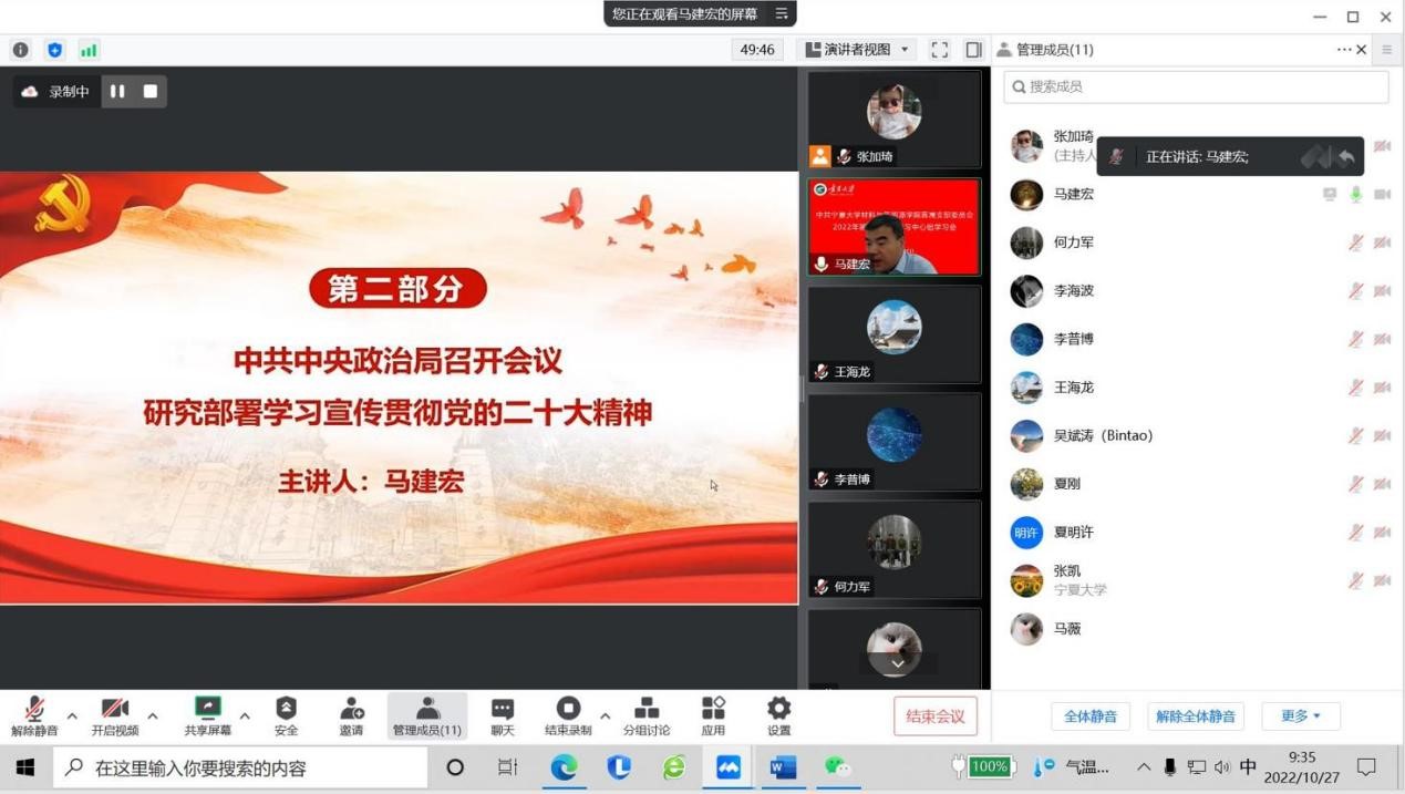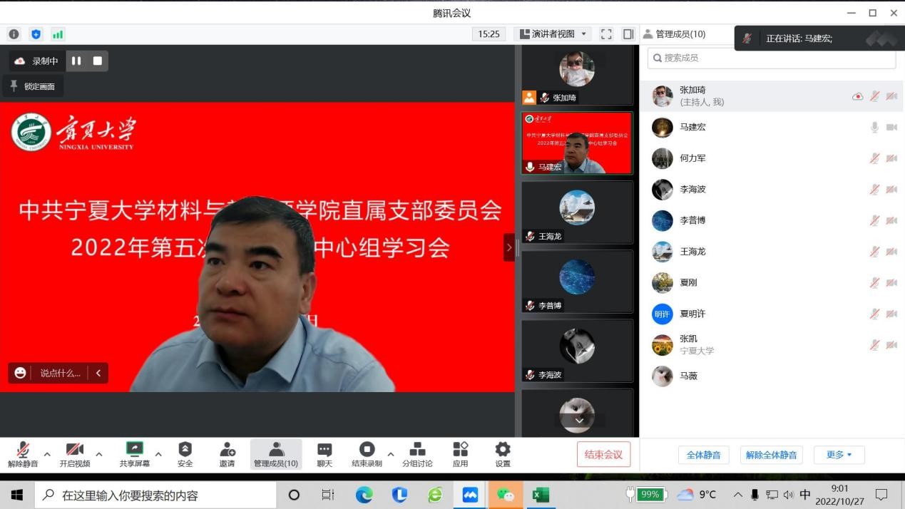 2022年10月27日上午,学院通过线上形式召开直属党支部委员会理论学习中心组第五次学习会,会议由直属党支部书记马建宏同志主持,常务副院长何力军同志领学,直属党支部委员、各党小组组长、各办公室负责人以及教师代表参加会议。