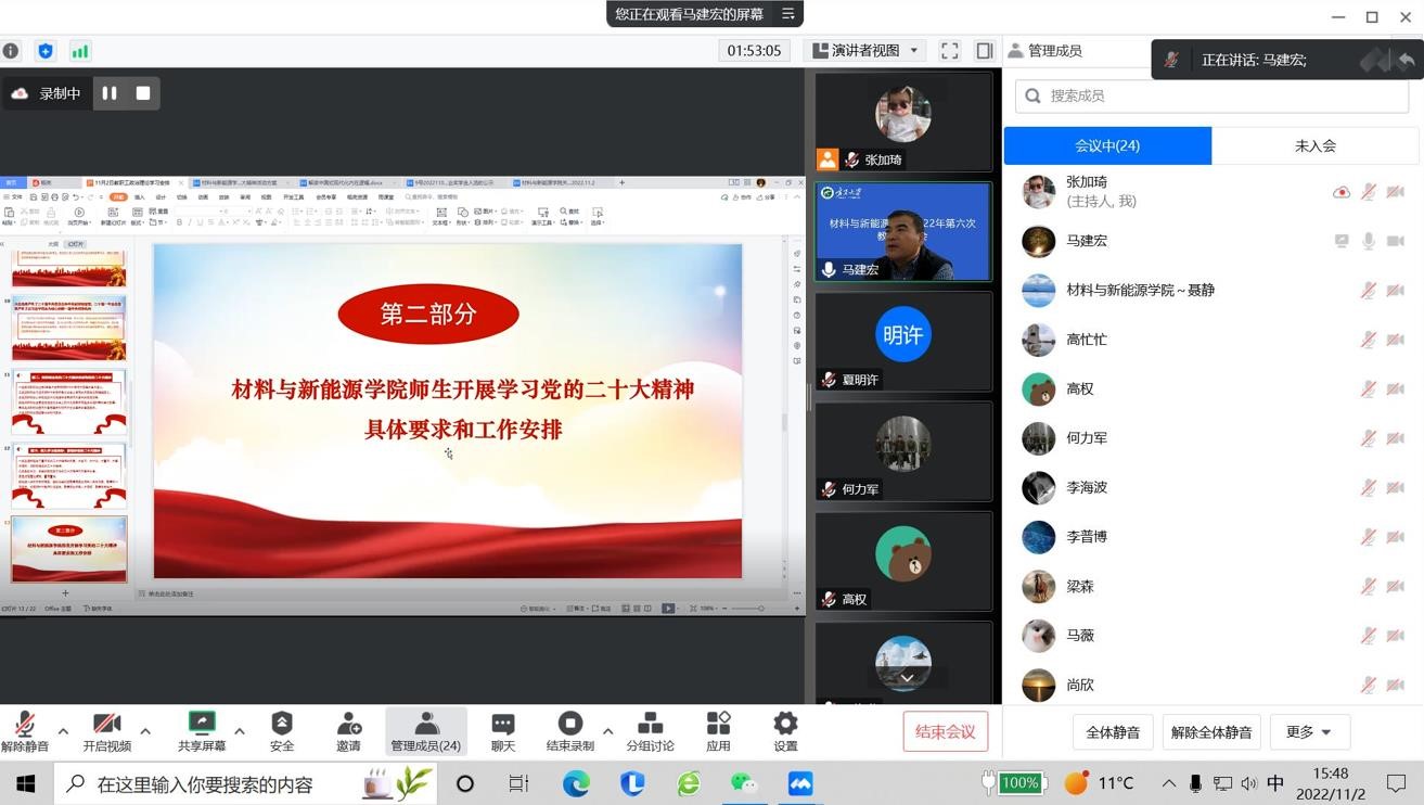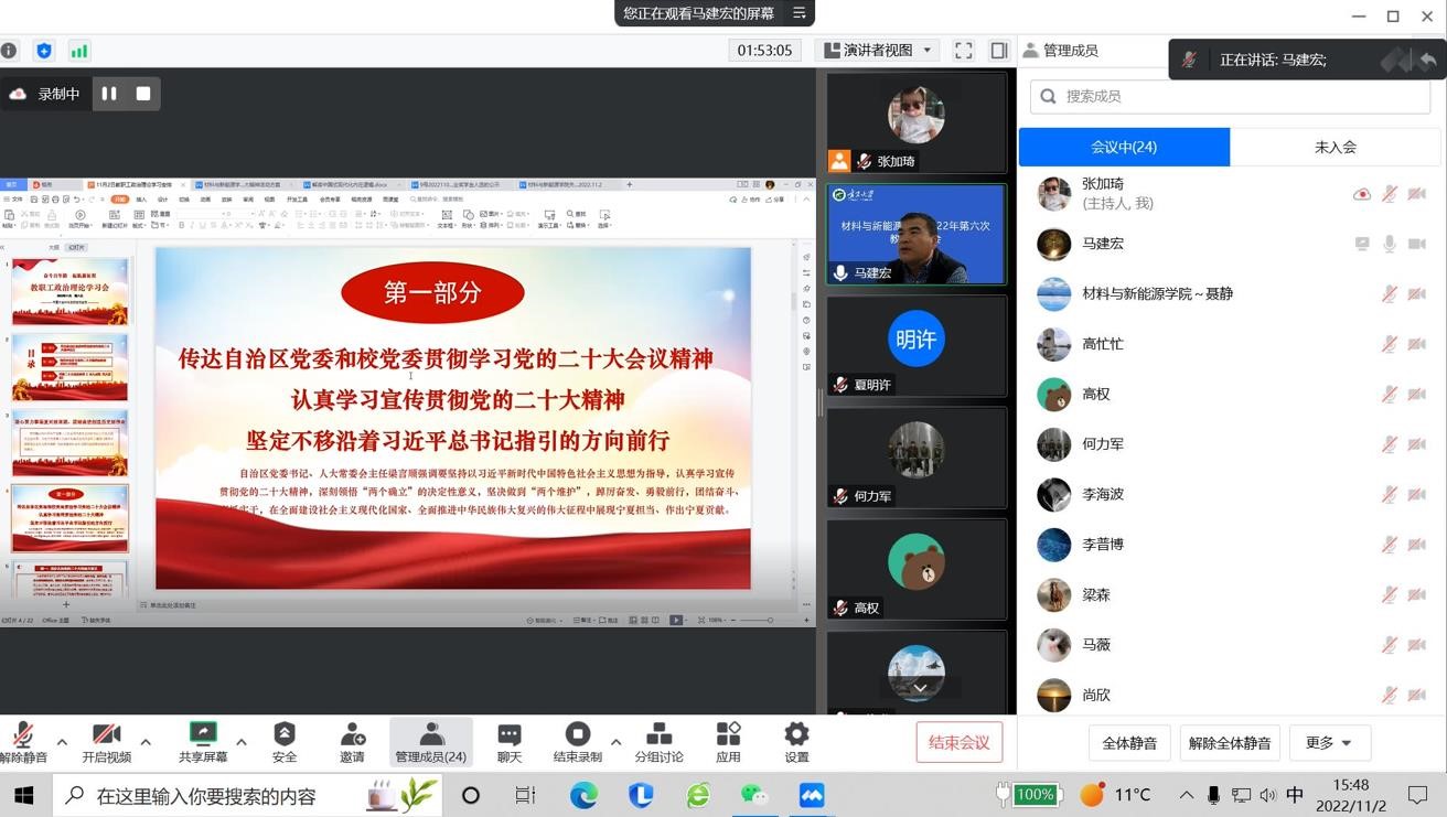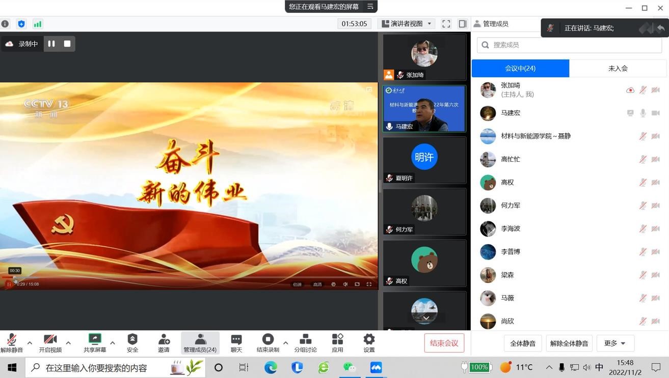 2022年11月2日下午,学院通过线上会议形式召开了2022年第八次教职工政治理论学习会。会议由直属党支部书记马建宏同志主持并领学,学院全体教职工参会。