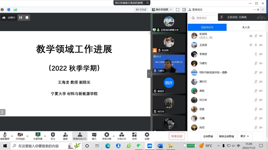 王海龙副院长汇报了组建基层教学组织、材工科培养方案修订、新生入学教育、教学实验室建设等教学领域相关工作情况。