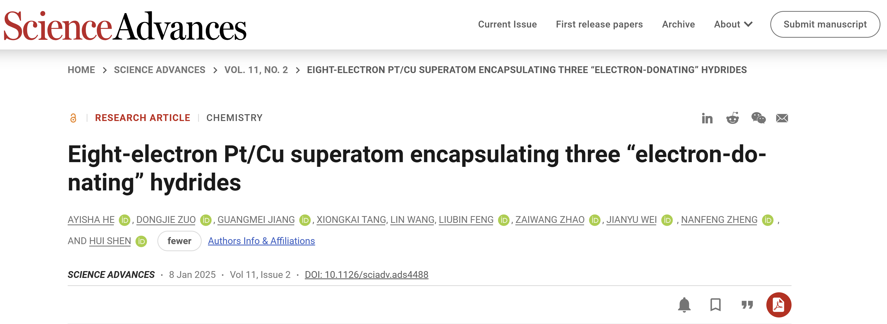魏建宇课题组与内蒙古大学沈慧教授团队、厦门大学郑南峰院士团队通力合作,在纳米团簇中的“金属氢”领域取得了突破性成果。他们成功将单个团簇中“金属氢”的数目提升至3个。相关研究成果以“Eight-Electron Pt/Cu Superatom Encapsulating Three “Electron-Donating”Hydrides”为题,于2025年1月8日在Science Advances上发表。