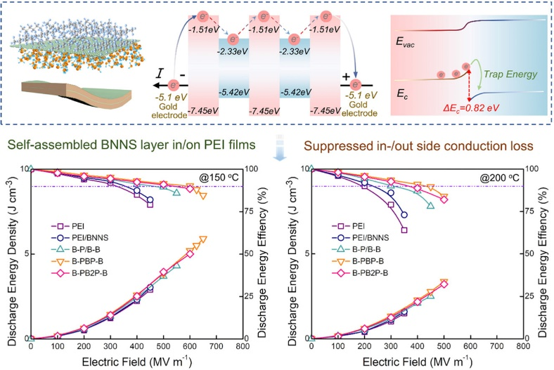 针对聚合物电介质电容器在高温强电场环境下储能性能劣化的问题,文章提出通过氮化硼纳米片(BNNS)在聚醚酰亚胺(PEI)薄膜表面/内部连续自组装,实现了电极/体传导损耗的协同抑制。文章揭示了高温下电极注入与体相载流子传输的耦合增强效应机制,开发了"双界面调控"技术,突破传统单一界面或体相改性的局限性。通过等离子体改性实现单层BNNS的连续致密排布,在保持90%以上充放电效率的同时,显著提升了150–200°C高温下的储能性能。实验与模拟证实该结构使电荷跳跃距离缩短、陷阱能级显著加深、击穿场强大幅提高。该工作基于商用材料与可规模化自组装工艺,为光伏/风力发电、新能源汽车等用耐高温电容器提供了兼具高性能与产业化潜力的新思路。