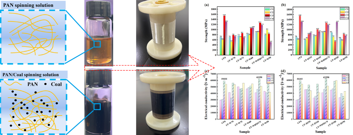 为了降低碳纤维的生产成本,文章将酸处理煤和聚丙烯腈(PAN)粉末溶解到二甲基亚砜(DMSO)溶剂,利用干喷湿纺技术制备了煤/PAN复合纤维,通过优化纺丝工艺和预氧化碳化工艺,制得煤/PAN基碳纤维,其拉伸强度可达1271 MPa,电导率为62398 S·m⁻¹。本研究为开发低成本碳纤维和煤的高值化利用提供了新思路。