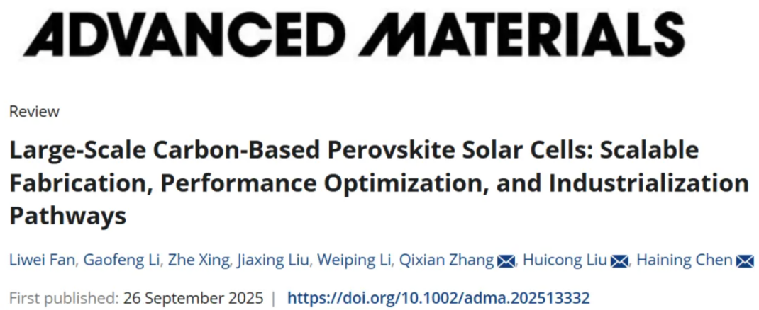 张啟先副教授与北京航空航天大学陈海宁教授、刘慧丛副教授合作,在国际著名期刊Advanced Materials上发表了题为“Large-Scale Carbon-Based Perovskite Solar Cells: Scalable Fabrication, Performance Optimization, and Industrialization Pathways”的高水平综述文章。北京航空航天大学、双色球