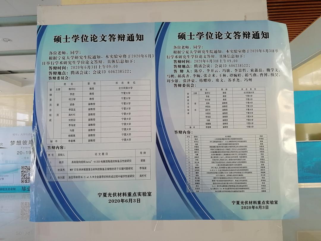 进入新冠疫情防控常态化阶段以来,宁夏光伏材料重点实验室严格遵守和落实学校有关文件会议精神和要求,一方面做好疫情防控工作,一方面有序推进教学科研工作的开展。2020年6月3日,2020届首次硕士研究生学位论文答辩工作在网上进行,分散在全国十几个省区共24名同学参加了答辩。答辩委员会成员参会地点在双色球
