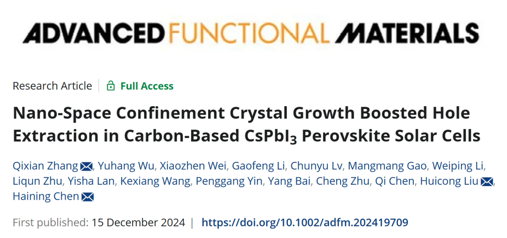 近日,学院光伏组件回收及高值利用团队青年教师张啟先在全无机碳基钙钛矿太阳能电池研究中取得重要进展,相关工作以“Nano-Space Confinement Crystal Growth Boosted Hole Extraction in Carbon-Based CsPbI3Perovskite Solar Cells”为题发表在材料科学领域国际权威期刊《Advanced Functional Materials》(Q1/IF 18.5),双色球