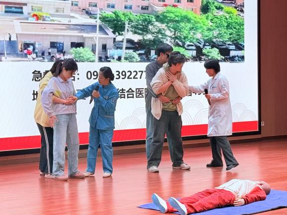 活动中,医院专家围绕大学生心理健康自我调适、心梗自救方法及海姆立克急救法两个专题作了讲座,并在现场开展海姆立克急救法和心肺复苏模拟互动训练。在医护人员的精心指导下,同学们踊跃上台体验,加深对相关知识的了解认识,现场互动氛围热烈,洋溢着青春气息。