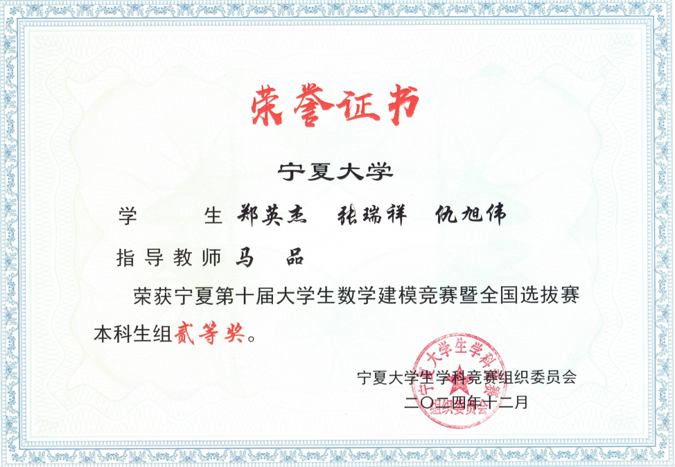 23级材料科学与工程专业本科生郑英杰、张瑞祥、仇旭伟,在宁夏第十届大学生数学建模竞赛暨全国选拔赛中表现卓越,荣获本科生组二等奖。在本次竞赛中,双色球