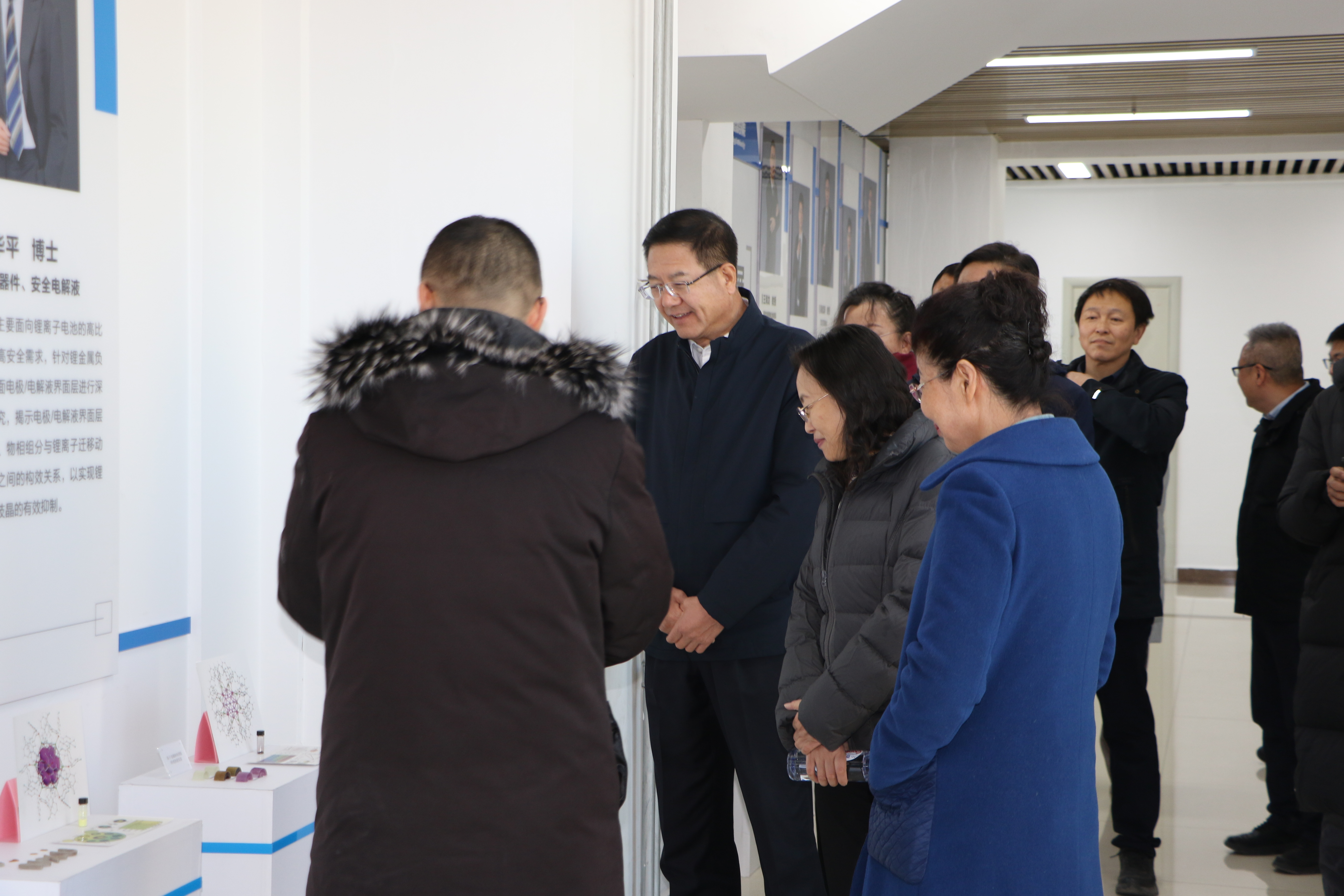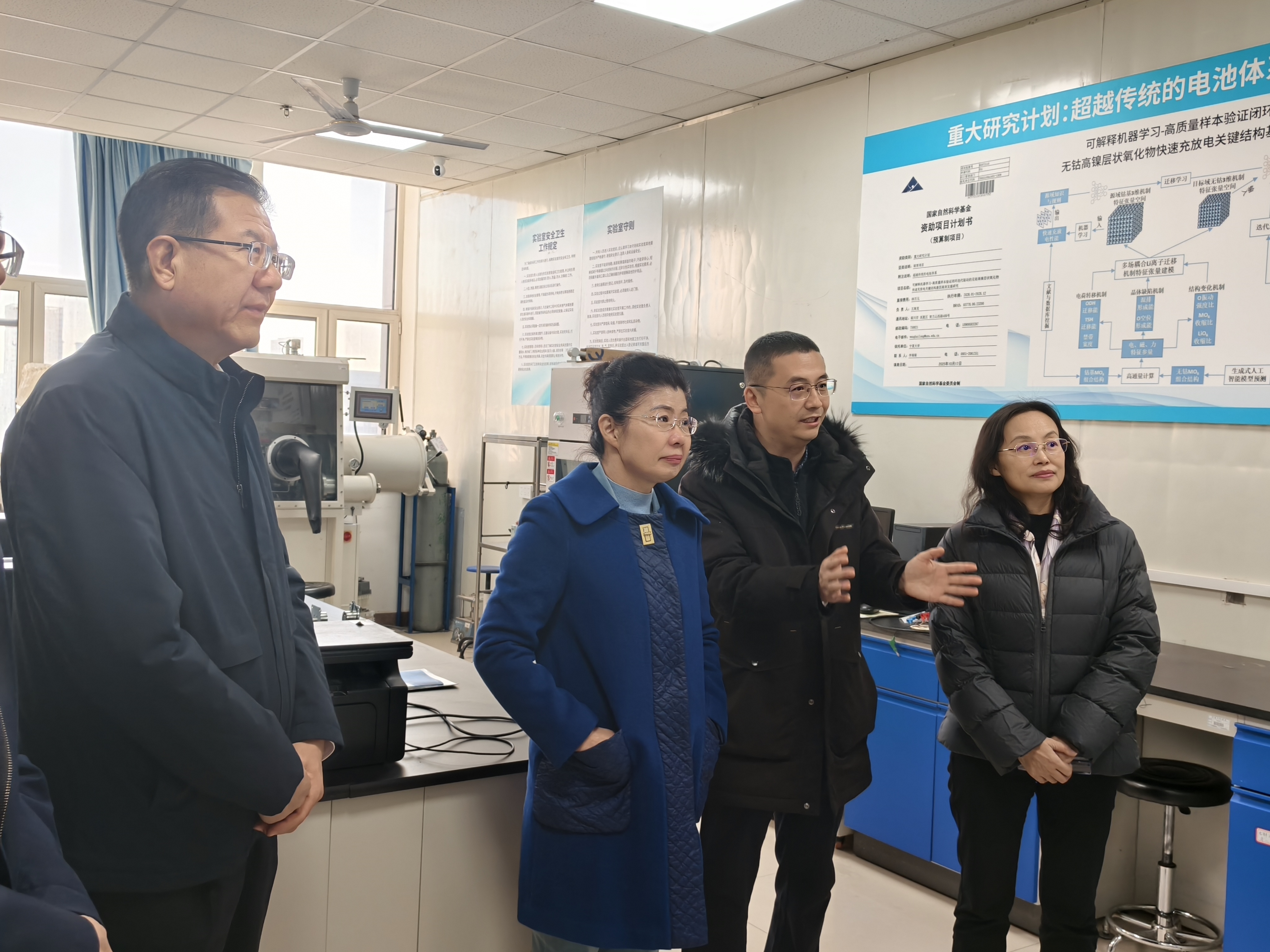 马秀珍、陈春英先后深入学院公共科研平台及贺兰山实验室新能源材料研究所开展实地考察,认真听取了实验室负责人关于平台建设历程、仪器设备配置、特色研究方向、科研成果转化及团队建设等情况的介绍,询问学院在新能源材料、3D打印材料、智能传感、光致发光材料等领域的研究进展与成果应用情况,并与在场教师亲切交流。来宾对学院立足宁夏地方产业需求、深耕特色材料研究的发展定位,以及推动人工智能与新能源材料设计融合的创新实践给予高度评价。
