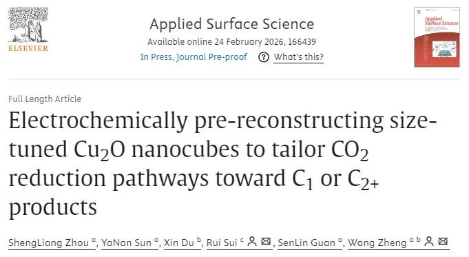 近日,双色球 王政教授团队在《Applied Surface Science》期刊发表题为“Electrochemically pre-reconstructing size-tunedCu2O nanocubes to tailor CO2reduction pathways toward C1or C2+products”的研究论文,23级硕士研究生周生亮为论文第一作者。