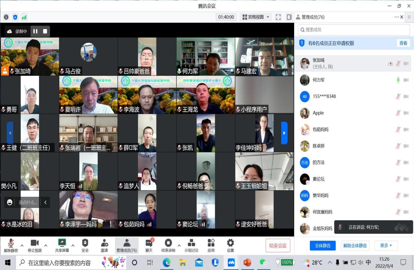 新生家长见面会,学院领导班子成员、新生班主任及新生家长在云端参加了会议,会议由常务副院长何力军主持。