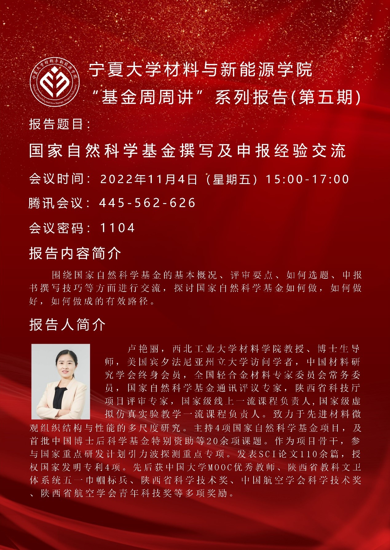 2022年11月4日下午,学院通过线上会议形式举办了“基金周周讲”第五期报告。报告由李海波副院长主持,西北工业大学材料学院卢艳丽教授主讲,学院全体教师参加,全国高校相关领域教师聆听了报告。