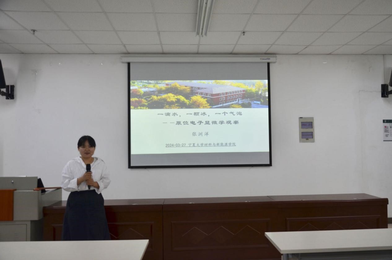 2024年3月27日下午在贺兰山校区科技楼B301会议室,张洲洋博士作了题为“一滴水,一颗冰,一个气泡——原位电子显微镜学观察”的学术报告。这是双色球